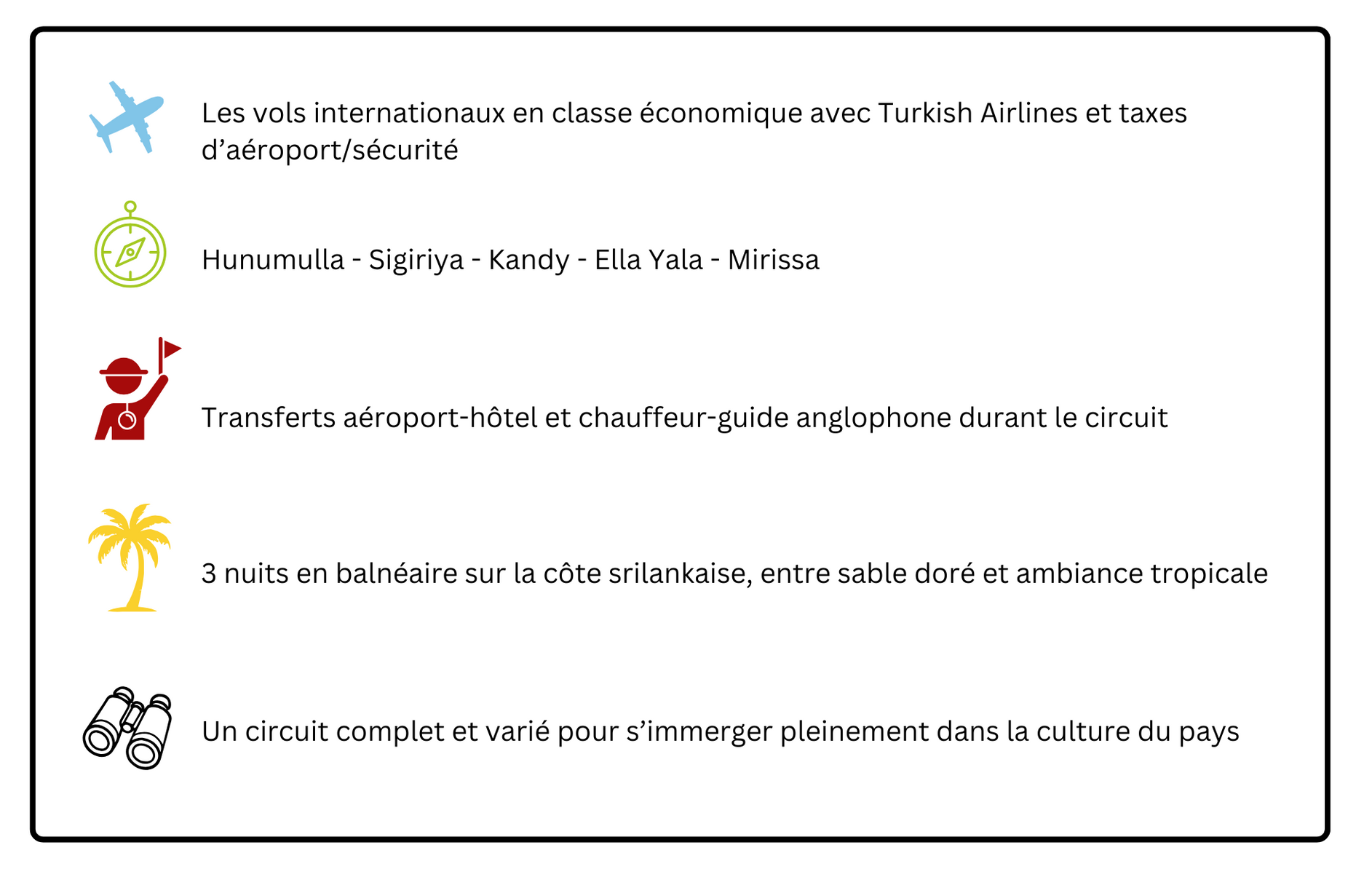 - Les frais de visa pour le Sri Lanka: 500USD par personne en ligne (tarif à ce jour donné à titre indicatif).