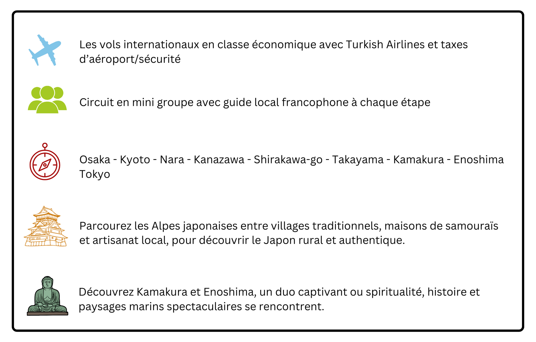 Découvrez le Japon en petit groupe et plongez dans l’effervescence urbaine d’Osaka, admirez la sérénité des temples de Kyoto et laissez-vous charmer par le village pittoresque de Shirakawa-go. Flânez dans les quartiers traditionnels, visitez des maisons de thé, parcourez les marchés animés et goûtez à la cuisine locale. Imprégnez-vous des coutumes et codes de politesse japonais, laissez-vous émerveiller par les jardins raffinés, les châteaux majestueux et les paysages d’une beauté saisissante. Entre histoire, traditions et contemplation, chaque étape vous offrira une expérience inoubliable.